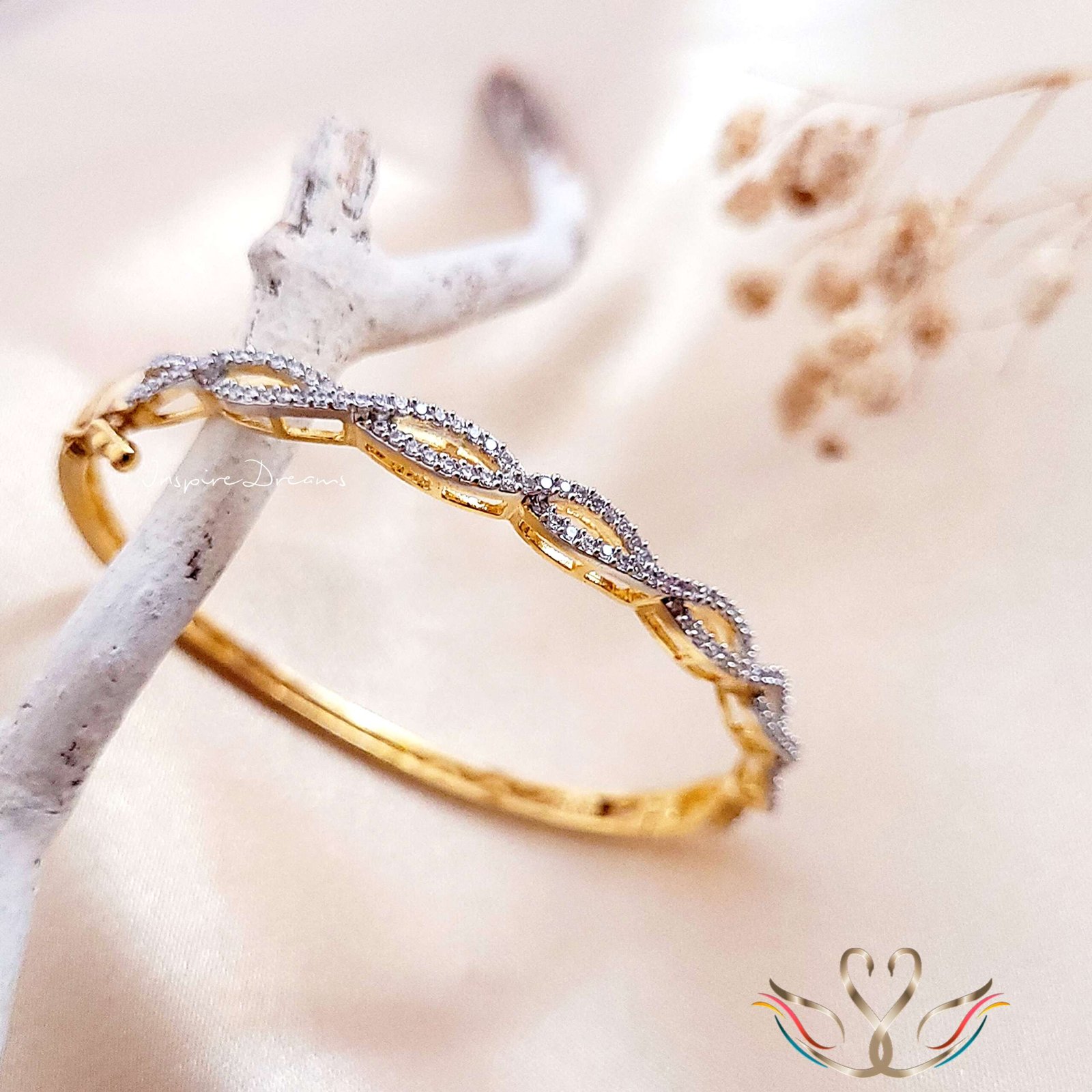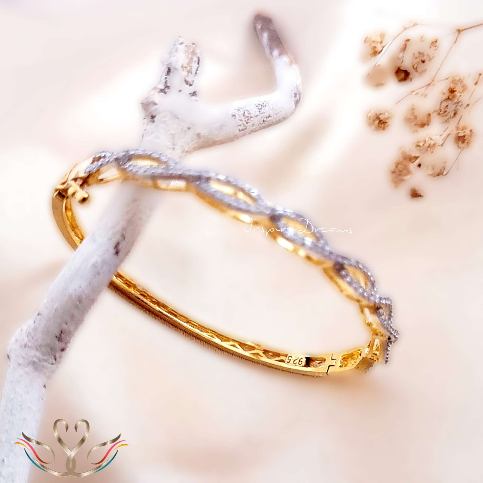 Elegant gold-plated bangle featuring exquisite cubic zirconia stones in an interlocking loop design. Crafted from 92.5 hallmark pure silver with a secure clip lock closure.