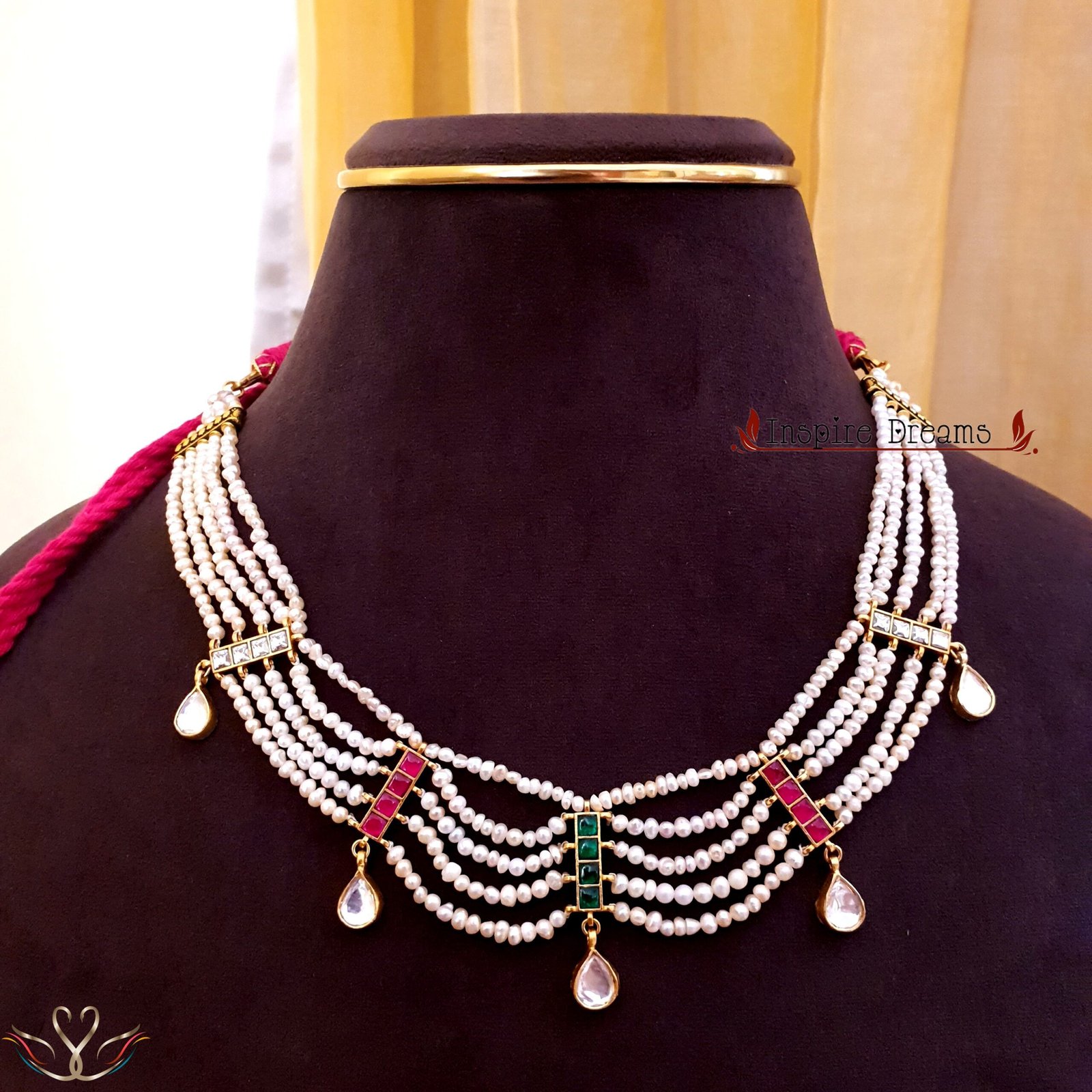 Introducing the Regal Pearl Necklace, a stunning piece that effortlessly infuses elegance into any outfit. Crafted with layered strands of lustrous pearls and adorned with beautiful 92.5 gold-plated kundan teardrop pendants, this necklace is not just a piece of jewelry but a statement of grace and sophistication. Measuring 16 inches in length, it sits comfortably around your neck, making it a versatile accessory for both casual and formal occasions.