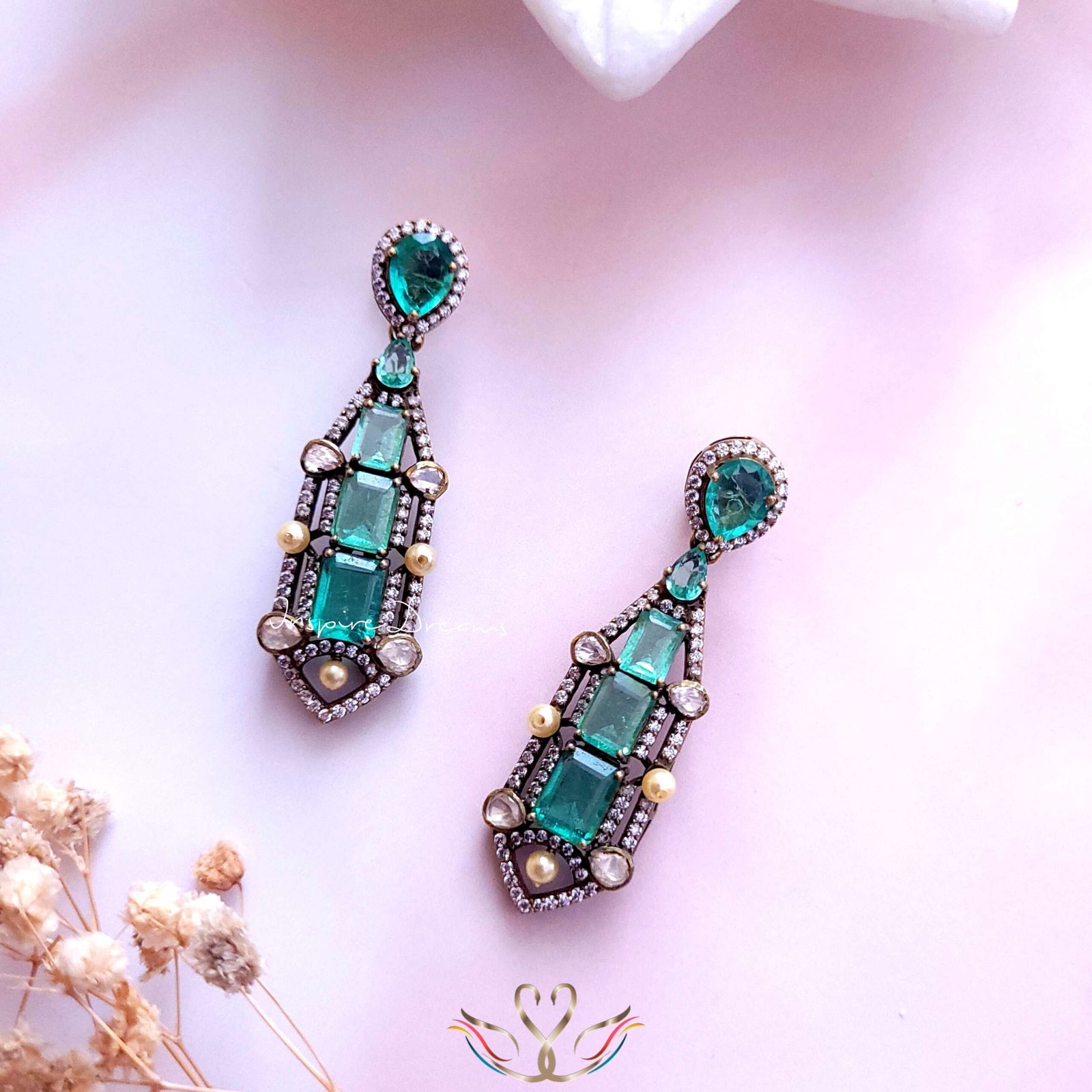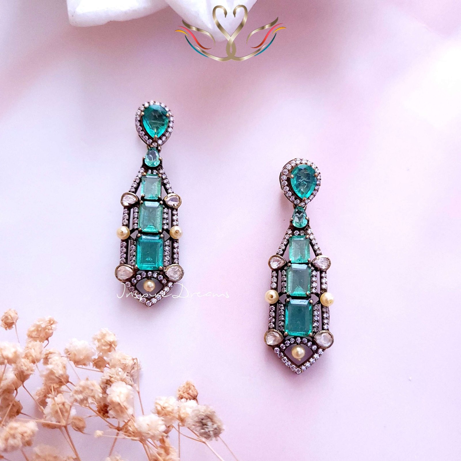Add timeless charm to your jewelry collection with these exquisite Victorian-inspired earrings. Crafted from 92.5 pure silver and hallmarked for authenticity, this elegant pair features radiant emerald stones accented with cubic zirconia, creating a luxurious vintage appeal. The antique gold-plated finish enhances its royal aesthetic, making it perfect for weddings, festive occasions, and statement styling.