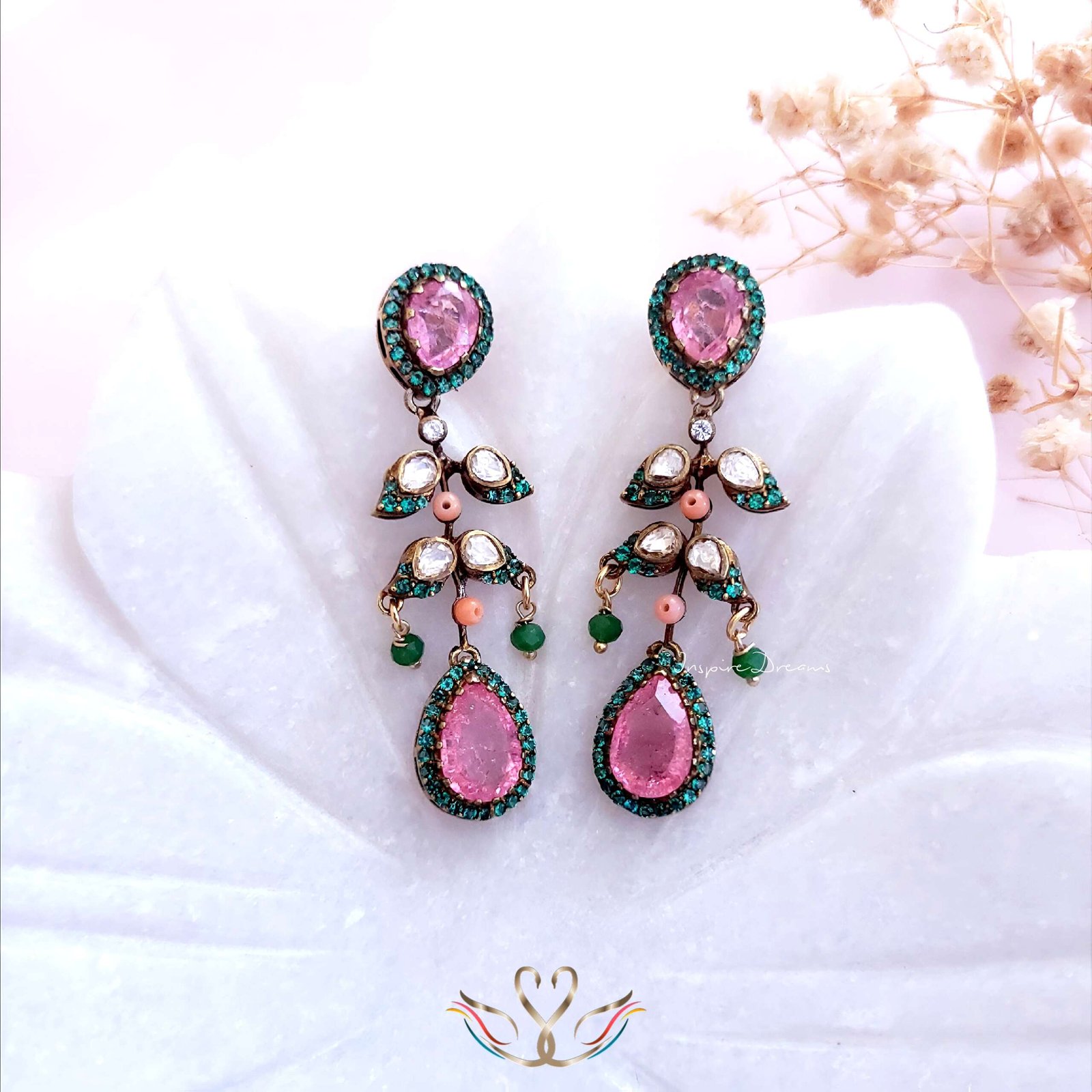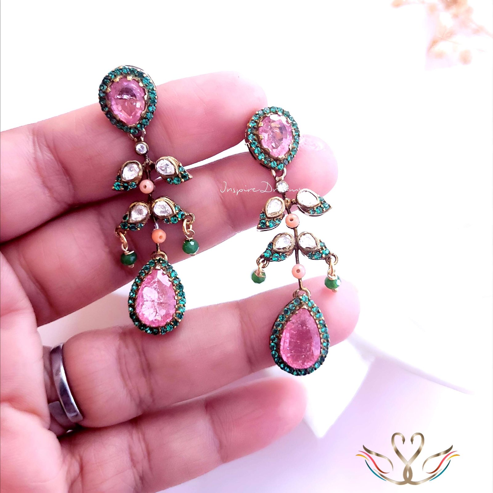 These intricately designed Victorian earrings are crafted from 92.5 pure silver and adorned with pink tourmaline and cubic zirconia stones. Finished with antique gold plating, they offer a graceful and affordable luxury option for everyday festive wear.